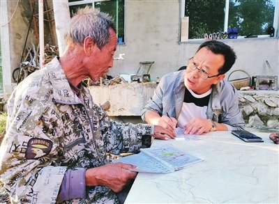 郝軍(右)向有經(jīng)驗(yàn)的村民請(qǐng)教種田經(jīng)驗(yàn)。□楊明 攝