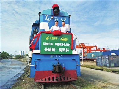 2018年9月28日,首趟“景德鎮(zhèn)—莫斯科”郵政中歐班列從江西景德鎮(zhèn)車站駛出,作為本趟班列的運營平臺公司員工,侯磊(右)參加了班列首發(fā)儀式。□皮沐璇 攝