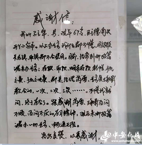 9月22日一大早,郵儲銀行亳州市立德鎮(zhèn)支行剛剛營業(yè),一位老大爺匆匆走進網(wǎng)點大廳,對工作人員說:“你們負責人在嗎?”還沒等工作人員回話,老大爺接著說:“我是來送感謝信的,感謝你們工作人員不厭其煩的教會我辦理各項業(yè)務。”邊說老人邊從口袋里掏出一封手寫的感謝信。