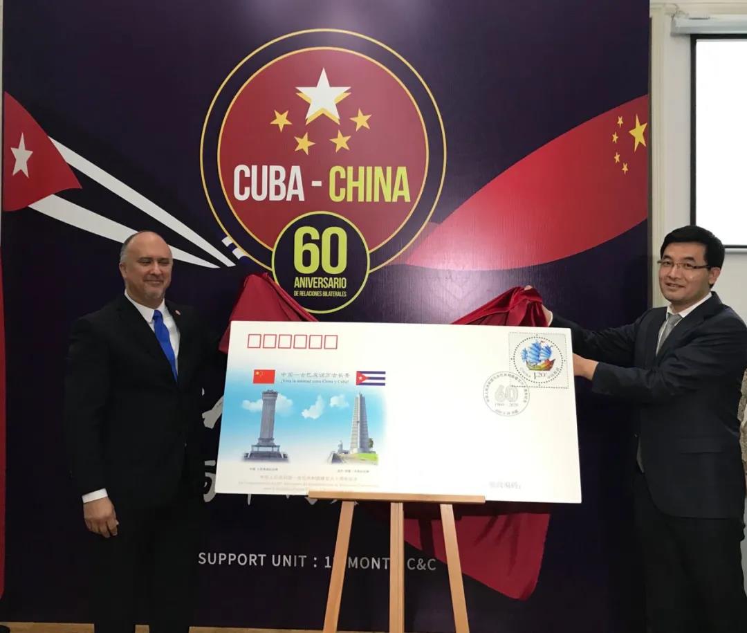 9月28日是中國古巴建交60周年紀(jì)念日。古巴駐華大使館舉行慶祝招待會(huì),國務(wù)委員兼外長王毅出席。為了紀(jì)念這個(gè)特殊的日子,中國集郵總公司特發(fā)行外交紀(jì)念封一枚。招待會(huì)上,中國郵政集團(tuán)有限公司總經(jīng)理張金良與古巴駐華大使佩雷拉共同為紀(jì)念封揭幕,張金良代表中國郵政集團(tuán)有限公司向古巴大使館贈(zèng)送紀(jì)念封。