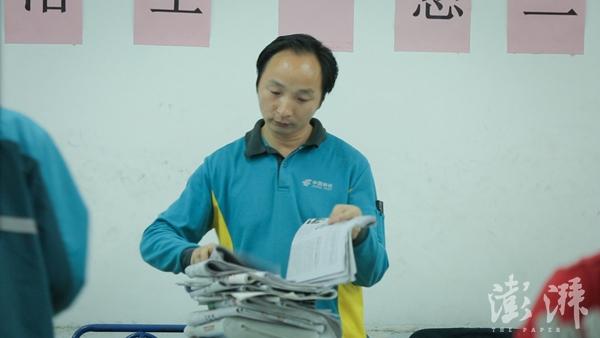郭振濤:我今年40歲,江蘇高郵人,在上海市臨平路郵局工作已經(jīng)12年了。日常就是早上五六點(diǎn)鐘到郵局來(lái)進(jìn)行信件分揀,把自己那塊區(qū)域的挑出來(lái)。挑出來(lái)以后,按你的投遞路線把它排好,排好再處理報(bào)刊書籍,正常在單位忙完要到10點(diǎn)鐘左右出去。出去投遞三四個(gè)小時(shí),到中午忙的時(shí)候可能連吃飯的時(shí)間都沒(méi)有。下午郵件報(bào)籍又來(lái)一批,然后出去再跑一趟三個(gè)小時(shí),差不多能結(jié)束工作。一天是也很忙的。