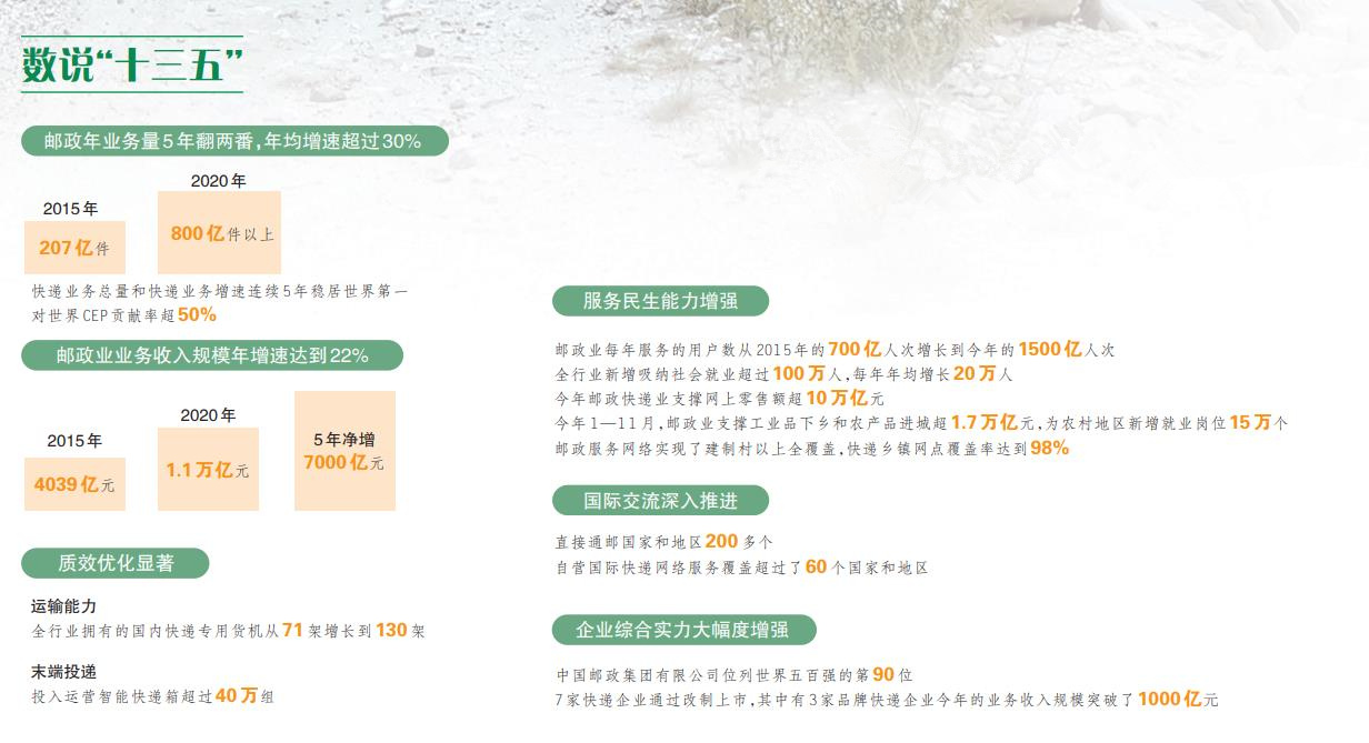 5年來,郵政業(yè)發(fā)展突飛猛進(jìn)。快遞年業(yè)務(wù)量從2015年的207億件增長(zhǎng)到今年的800億件以上,5年翻了兩番。我國(guó)包裹快遞量超過了美國(guó)、日本、歐洲等發(fā)達(dá)經(jīng)濟(jì)體總和,對(duì)世界CEP(快遞包裹)市場(chǎng)貢獻(xiàn)率超過了50%。2019年,中國(guó)郵政行業(yè)業(yè)務(wù)收入累計(jì)完成9642.5億元,與此同時(shí),城市末端智能快件箱的市場(chǎng)需求快速增長(zhǎng),農(nóng)村郵政服務(wù)網(wǎng)絡(luò)及扶貧成果引人矚目……回望“十三五”,郵政業(yè)拔節(jié)孕穗、碩果累累。坐上駛向人民美好生活的郵車,一幅幅美妙的圖景不斷閃現(xiàn)。