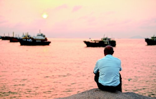 下班后,謝堅(jiān)在廣東珠海市外伶仃島海邊望著遠(yuǎn)方(2020年4月21日攝)。 本報(bào)記者鄧華攝