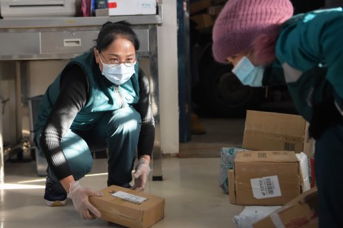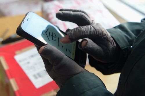 每天上午八點(diǎn)半,韓金花就開始工作,要一直忙碌到天黑。為了御寒,韓金花提前準(zhǔn)備了暖足貼,外出工作時貼到腳上。她在手套的拇指與食指部分剪了洞,露出手指,方便在設(shè)備中錄入快遞信息。寒冬里,手指經(jīng)常凍得失去知覺。“今年10月份我就要退休了,我要站好最后一班崗。”她說。