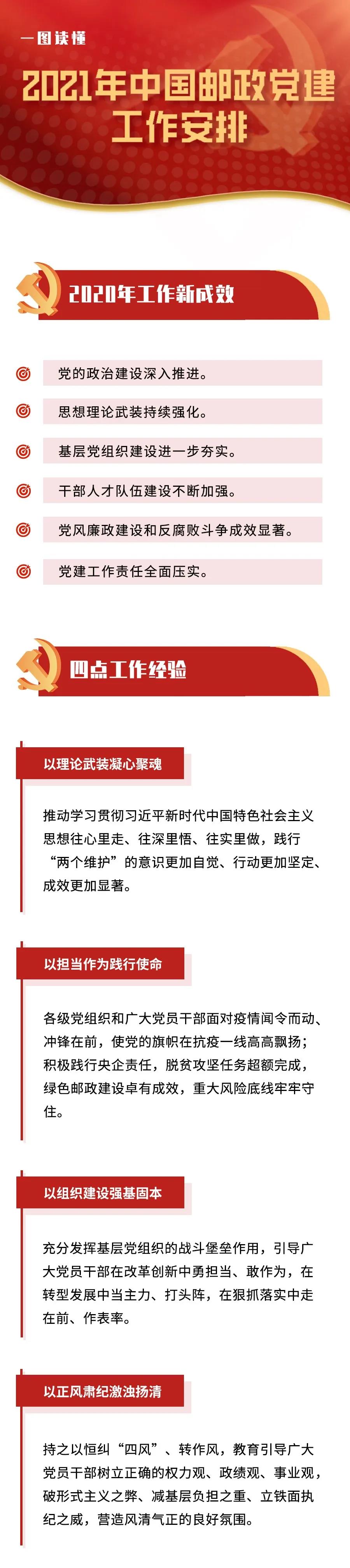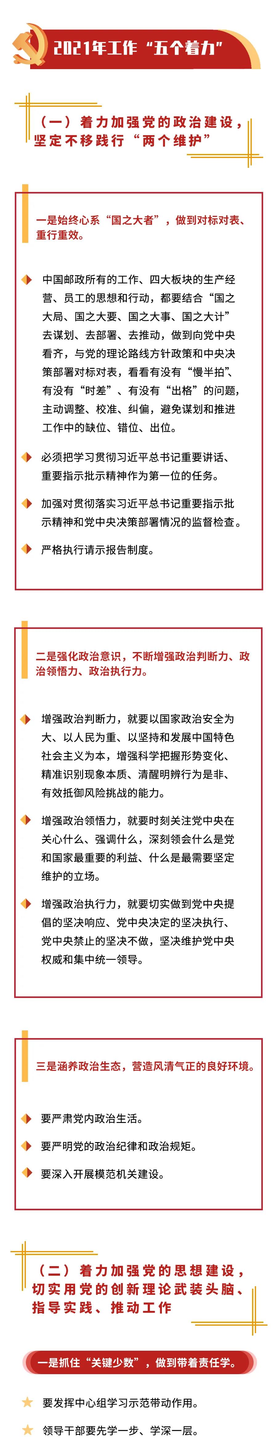 1月28日,2021年中國郵政集團有限公司黨的建設暨黨風廉政建設和反腐敗工作會議召開。這次會議是在中國郵政立足新階段、邁向新征程的重要時刻提升政治站位、激發(fā)擔當作為、凝心聚力推動發(fā)展的一次政治動員。會議總結(jié)2020年中國郵政黨的建設以及黨風廉政建設和反腐敗工作,部署2021年重點任務,提出把2021年作為“黨建質(zhì)量提升年”,以高質(zhì)量黨建引領高質(zhì)量發(fā)展,為打造“六維共生”的新郵政、推動中國郵政二次崛起提供堅強政治保證。