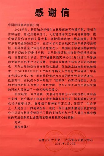 日前,吉林省紅十字會致信中國郵政集團(tuán)有限公司,感謝吉林郵政迅速啟用抗疫物資運(yùn)輸綠色通道,第一時(shí)間將吉林省紅十字會價(jià)值近百萬元的抗疫物資運(yùn)達(dá)通化、松原兩市,對中國郵政集團(tuán)有限公司和吉林省分公司在吉林省疫情防控工作中給予的支持和為紅十字人道主義事業(yè)作出的突出貢獻(xiàn)致以崇高的敬意和衷心的感謝。