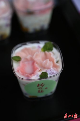 據(jù)了解,這種“櫻花面”,是用特殊模具生產(chǎn)的櫻花瓣形狀的面片。在現(xiàn)場(chǎng),幾朵煮熟的櫻花面片,就像一朵朵粉色的櫻花,軟軟萌萌,很是可愛(ài);與水果、芝士搭配,再點(diǎn)綴幾片新鮮薄荷,這樣的日系美食很受女孩喜歡。