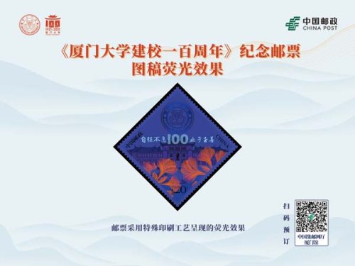 該套郵票由史淵設(shè)計(jì)師設(shè)計(jì),北京郵票廠采用兩色雕刻印制,熒光燈下,鳳凰花花團(tuán)簇?fù)硐碌膹B門大學(xué)校訓(xùn),躍然方寸之上。