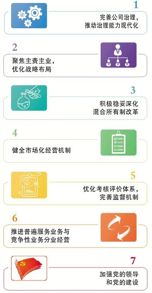 2.七個方面重點改革任務(wù)。《實施方案》根據(jù)中國郵政改革落地過程中遇到的重點難點問題,提出:一是完善公司治理,推動治理能力現(xiàn)代化,全面貫徹“兩個一以貫之”,把黨的領(lǐng)導(dǎo)融入公司治理各環(huán)節(jié),實現(xiàn)制度化、規(guī)范化、程序化,加強(qiáng)董事會建設(shè),落實董事會職權(quán),保障經(jīng)理層依法行權(quán)履職,開展對標(biāo)世界一流企業(yè)管理提升行動,加強(qiáng)各類風(fēng)險管控,完成子企業(yè)公司制改制。二是聚焦主責(zé)主業(yè),優(yōu)化戰(zhàn)略布局,圍繞服務(wù)國家戰(zhàn)略,構(gòu)筑中國郵政高質(zhì)量發(fā)展的“四梁八柱”,推動普遍服務(wù)能力提升,推動寄遞業(yè)務(wù)核心競爭力提升,推動郵儲銀行高質(zhì)量發(fā)展,推動代理金融轉(zhuǎn)型發(fā)展,推動中郵保險價值發(fā)展,推動農(nóng)村電商生態(tài)圈建設(shè),推動惠農(nóng)合作項目協(xié)同發(fā)展,推動資產(chǎn)重組與盤活,推動自主創(chuàng)新能力提升,清理退出不具備競爭優(yōu)勢的非主營業(yè)務(wù)和低效無效資產(chǎn),完成剝離國有企業(yè)辦社會職能,解決歷史遺留問題。三是積極穩(wěn)妥深化混合所有制改革,把握好改革方向,務(wù)求改革實效,避免盲目性,避免一混了之。按照完善治理、強(qiáng)化激勵、突出主業(yè)、提高效率的要求,堅持因地施策、因業(yè)施策、因企施策,宜獨則獨、宜控則控、宜參則參,分層分類深化混合所有制改革,穩(wěn)慎開展混合所有制企業(yè)骨干員工持股,推動混合所有制企業(yè)深度轉(zhuǎn)化經(jīng)營機(jī)制,加強(qiáng)對混合所有制改革全過程的監(jiān)督,防止國有資產(chǎn)流失。四是健全市場化經(jīng)營機(jī)制,強(qiáng)化各層級郵政企業(yè)、控股子公司市場主體地位,切實深化勞動、人事、分配三項制度改革,推行經(jīng)理層成員任期制和契約化管理,全面推進(jìn)用工市場化,完善市場化薪酬分配機(jī)制,穩(wěn)慎開展控股子公司中長期激勵。五是優(yōu)化考核評價體系,完善監(jiān)督機(jī)制,完善戰(zhàn)略績效考核評價體系,健全協(xié)同高效的監(jiān)督機(jī)制。六是認(rèn)真貫徹落實《關(guān)于新時代加快完善社會主義市場經(jīng)濟(jì)體制的意見》要求,推進(jìn)普遍服務(wù)業(yè)務(wù)與競爭性業(yè)務(wù)分業(yè)經(jīng)營。七是加強(qiáng)黨的領(lǐng)導(dǎo)和黨的建設(shè),加強(qiáng)黨的政治建設(shè),推進(jìn)黨建工作與生產(chǎn)經(jīng)營深度融合,加強(qiáng)領(lǐng)導(dǎo)班子建設(shè)和人才隊伍建設(shè),激勵領(lǐng)導(dǎo)人員擔(dān)當(dāng)作為,持續(xù)深入推進(jìn)全面從嚴(yán)治黨。