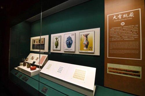 展覽現(xiàn)場,共展出郵票56套1732枚(含故宮主題郵票52套1590枚)、郵票手稿等珍貴展品54件、聯(lián)合發(fā)行首日封13件;配合郵票展出的25件故宮文物,涵蓋書畫、玉器、琺瑯器、青銅器、瓷器、家具等多個(gè)門類,與同主題的郵票交相輝映。