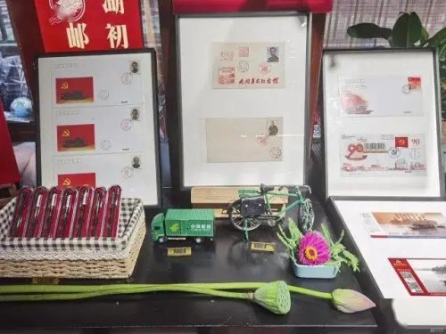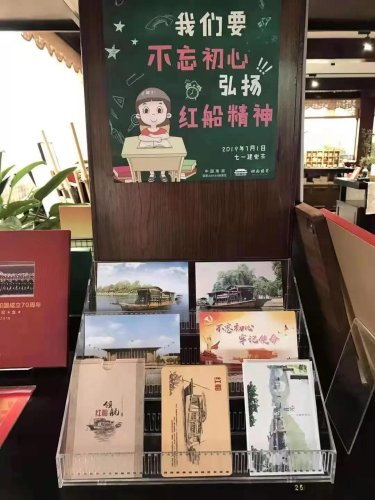 南湖初心郵局設(shè)立于煙雨樓前“南湖1921文創(chuàng)專營商店”,紅彤彤的郵政信筒上面印有“南湖初心郵局”字樣,精心布置的紅色文化展臺、琳瑯滿目的紅色題材郵品令人耳目一新。