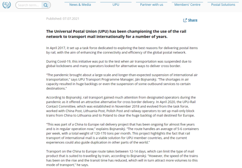 7月7日,萬國郵聯(lián)官網(wǎng)發(fā)布了一條有關(guān)中歐班列的報道。報道中,郵聯(lián)運輸項目組經(jīng)理揚·博伊南斯基肯定了中歐班列在疫情下的重要作用。