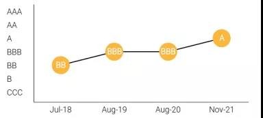 郵儲(chǔ)銀行2018-2021年MSCI ESG評(píng)級(jí)提升情況,圖片來源:MSCI ESG報(bào)告