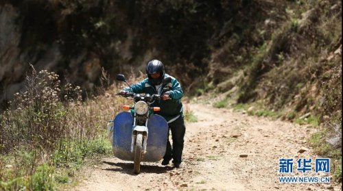 遇到陡坡路段,桑南才推著摩托車前行 趙普凡 攝