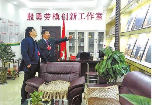 殷勇(右)向時(shí)任泗洪縣檢察院檢察長(zhǎng)介紹“殷勇勞模創(chuàng)新工作室”,并對(duì)檢察工作建言獻(xiàn)策