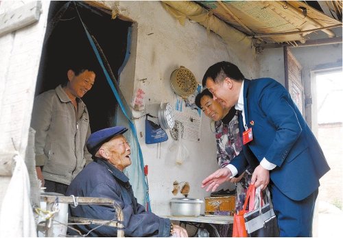 殷勇(右一)到農(nóng)戶家中走訪,為老人送去慰問(wèn)品