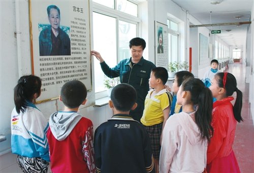 王明杰向葦沙河鎮(zhèn)小學的同學講述郵政“鐵人”宮本玉的事跡。□王家柱 攝
