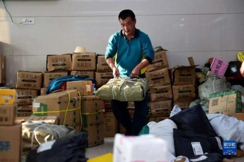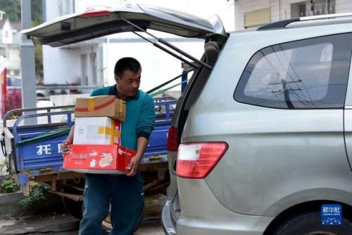 10月28日,在太湖縣北中鎮(zhèn)蓮花村,吳義陽將村民寄出的包裹搬運(yùn)上車。