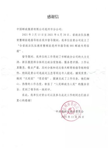 2021年3月15日至6月30日,省政法隊(duì)伍教育整頓駐亳指導(dǎo)組在亳州督導(dǎo)期間,在亳州郵政申請(qǐng)開(kāi)通了專用信箱用于接收相關(guān)郵件。亳州市分公司新區(qū)攬投部政治覺(jué)悟高,服務(wù)意識(shí)強(qiáng),工作認(rèn)真勤懇,嚴(yán)謹(jǐn)敬業(yè),每天及時(shí)分揀和投遞信件,做到“無(wú)延誤”“零差錯(cuò)”,圓滿完成了工作任務(wù)。