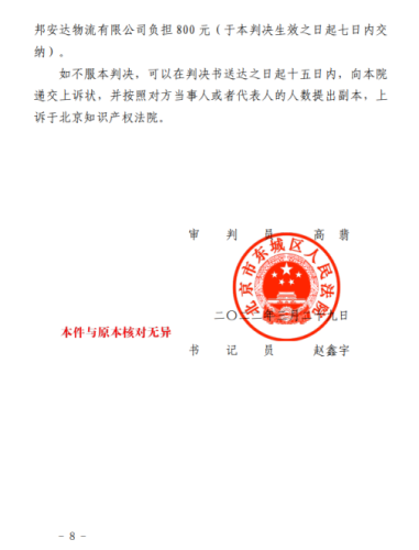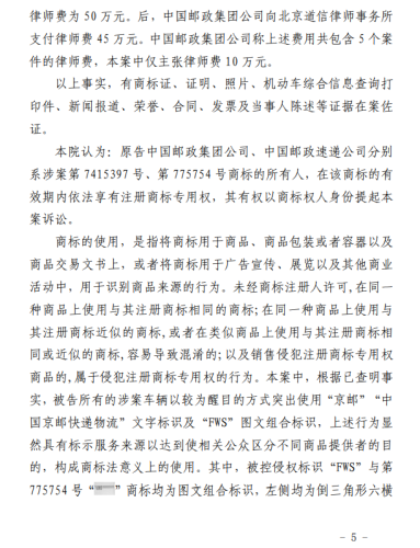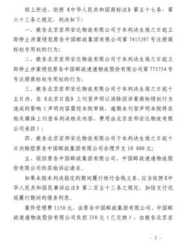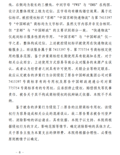 ”“中國郵政”商標構成近似,且涉案商標使用在物流運輸服務上,對于公眾而言容易導致對服務來源的誤認或認為經營者之間具有許可使用、關聯(lián)企業(yè)等特定關系,遂判令被告立即停止侵權行為、在《北京日報》上公開賠禮道歉并賠償中國郵政1萬元合理開支。