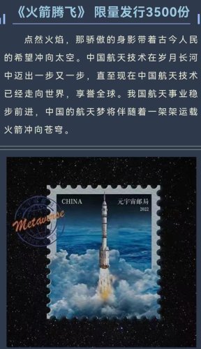 據(jù)介紹,明天共發(fā)行首套8款A(yù)I“航天主題”郵政數(shù)字藏品,包括由“星際口袋”平臺(tái)發(fā)行《火箭騰飛》《太空機(jī)械臂》《地外探尋》《太空漫步》4款,以及由“元郵數(shù)藏”平臺(tái)發(fā)行《實(shí)驗(yàn)飛船》《衛(wèi)星入軌》《深空探索》《火箭發(fā)射塔》4款。