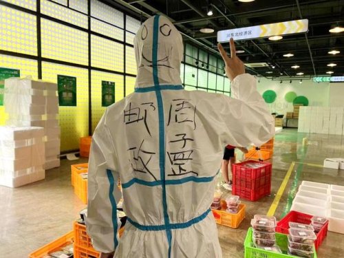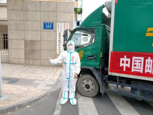 成都市郵政分公司相關(guān)負責人介紹,為了保證運輸生活物資能快速、新鮮、安全地到達管控區(qū)的居民手里,“郵遞小哥”每天穿著防護服至少14個小時,常常忙到深夜,第二天又奔赴在抗疫一線。