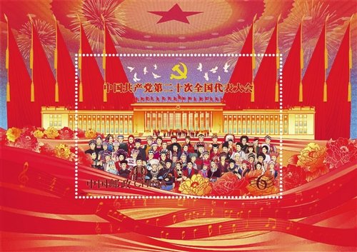 郵票小型張畫面以黨徽、紅旗、人民大會(huì)堂、歡慶的各族人民群眾為畫面主體,結(jié)合《萬歲!偉大的中國(guó)共產(chǎn)黨》《人民至上》《領(lǐng)航》三首謳歌新時(shí)代、歌頌黨團(tuán)結(jié)帶領(lǐng)人民建立豐功偉業(yè)的曲譜,并點(diǎn)綴牡丹花、和平鴿等元素,營(yíng)造了隆重?zé)崃业姆諊磉_(dá)了全國(guó)各族人民團(tuán)結(jié)奮斗,共同慶祝中國(guó)共產(chǎn)黨第二十次全國(guó)代表大會(huì)勝利召開的喜悅心情。