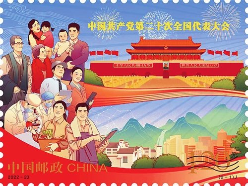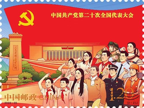 中國(guó)郵政定于2022年10月16日發(fā)行《中國(guó)共產(chǎn)黨第二十次全國(guó)代表大會(huì)》紀(jì)念郵票一套2枚、小型張1枚。郵票第一圖名稱為“奮進(jìn)新征程”,第二圖名稱為“建功新時(shí)代”,小型張圖案名稱為“慶祝中國(guó)共產(chǎn)黨第二十次全國(guó)代表大會(huì)勝利召開”。全套郵票面值為8.40元。郵票計(jì)劃發(fā)行1390萬套,小型張計(jì)劃發(fā)行790萬枚。