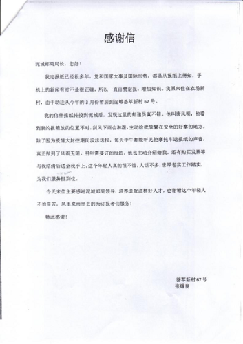 泥城鎮(zhèn)張先生來信感謝郵遞員唐鳳明