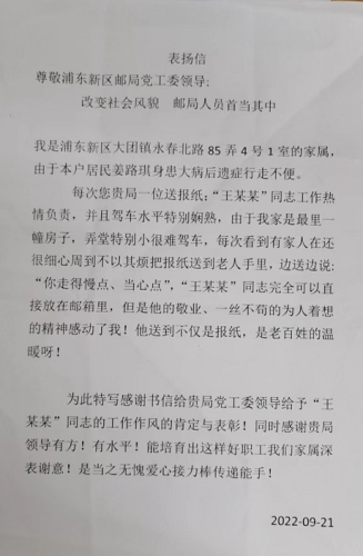 訂報用戶行動不便,郵遞員便穿過弄堂親自將報紙送到家中;報紙容易被雨淋濕,郵遞員又主動幫忙,將報箱移至最佳位置。日前,浦東郵政接連收到兩封用戶來信,對郵遞員王先明和唐鳳明熱心溫暖的服務(wù)表示感謝。