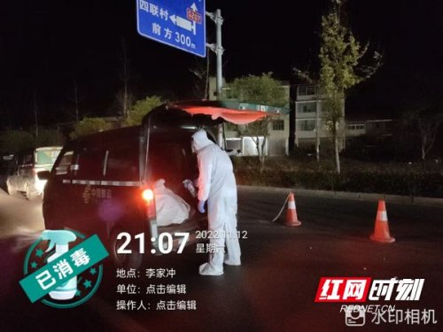 21點10分,郵車到達邵陽縣交接防疫卡口,邵陽縣郵政分公司陳偉、劉澤湘兩位同志穿上密封的防護服早已等候多時,他們將郵袋做了全面消殺處理,交接完成后駕駛郵車向目的地駛去。21點50分,郵件到達邵陽縣李家沖,兩人與其家人完成面交。