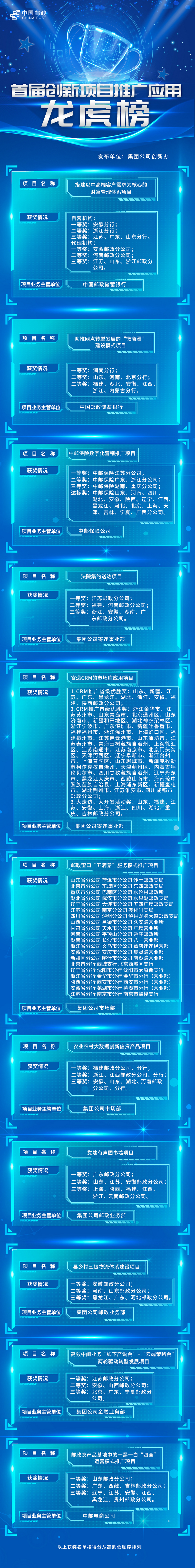 為更好地推動(dòng)優(yōu)秀創(chuàng)新項(xiàng)目推廣應(yīng)用及成果落地轉(zhuǎn)化,服務(wù)企業(yè)經(jīng)營(yíng)發(fā)展,中國(guó)郵政集團(tuán)有限公司組織開(kāi)展了首屆11個(gè)重點(diǎn)創(chuàng)新項(xiàng)目的全國(guó)推廣應(yīng)用工作,覆蓋了郵務(wù)、寄遞、金融等主要業(yè)務(wù)領(lǐng)域,推廣范圍涉及31個(gè)省(區(qū)、市)郵政分公司、36家郵儲(chǔ)分行、21家中郵保險(xiǎn)分公司,推廣期內(nèi)項(xiàng)目取得良好成效。