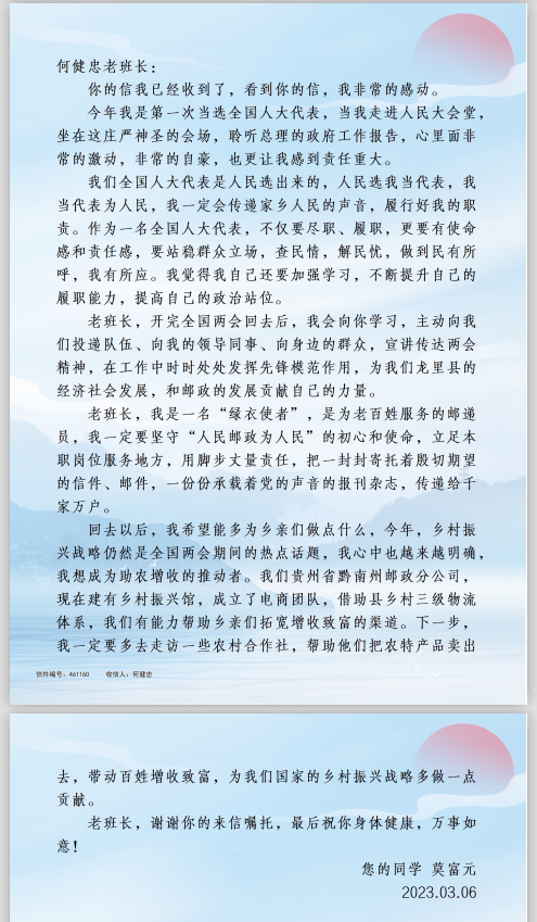 當(dāng)晚,何健忠懷著一名老代表的責(zé)任感,拿出紙筆在案頭奮筆疾書(shū),用傳統(tǒng)的書(shū)信形式、也代表著郵政人的儀式感,給兩位郵政系統(tǒng)新當(dāng)選的全國(guó)人大代表郭紅崗、莫富元送上了殷殷寄語(yǔ)。