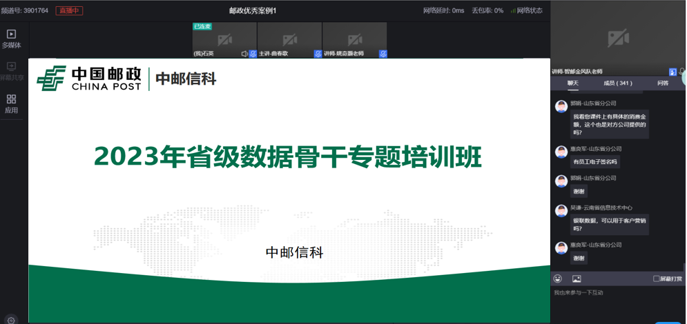 首次培訓(xùn)已于4月19日下午舉行,培訓(xùn)時(shí)長2.5小時(shí),培訓(xùn)內(nèi)容為2022年數(shù)據(jù)創(chuàng)新勞動賽優(yōu)秀案例,共三個(gè),分別是《寄遞業(yè)務(wù)客戶資費(fèi)風(fēng)險(xiǎn)管理模型》《風(fēng)險(xiǎn)防控方向智慧風(fēng)控體系下金融員工道德風(fēng)險(xiǎn)識別》《郵政農(nóng)品數(shù)字化運(yùn)營與智能營銷》,來自郵儲總行、中郵消費(fèi)等多家單位,各省數(shù)據(jù)中心、信息技術(shù)中心和部分地市數(shù)據(jù)條線的骨干共計(jì)340余人參加了此次培訓(xùn)。
