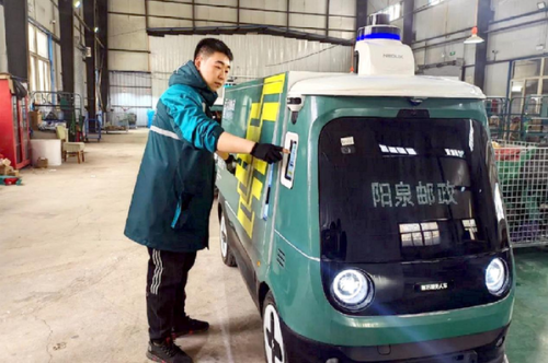 4月11日,在陽泉郵政開發(fā)區(qū)營業(yè)部分揀中心,郵政員工將快遞包裹裝進無人物流配送車車廂內(nèi)。輕點顯示屏操作后,無人物流配送車按照系統(tǒng)預設線路自動上路行駛,并將郵件投送到指定快遞自提點。