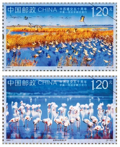 《中西建交五十周年》紀(jì)念郵票一套兩枚。郵票畫面以攝影作品為基礎(chǔ),表現(xiàn)了中國的衡水湖與西班牙的富恩特皮埃德拉湖,展現(xiàn)出兩國湖泊的旖旎風(fēng)光和自然生態(tài)特征,畫面構(gòu)圖簡(jiǎn)約明快、表現(xiàn)意境清朗優(yōu)美。該套郵票由馬立航設(shè)計(jì),北京郵票廠有限公司采用影寫版工藝印制。西班牙郵政將使用同樣的設(shè)計(jì)元素發(fā)行以“中西建交五十周年”為主題的郵票。