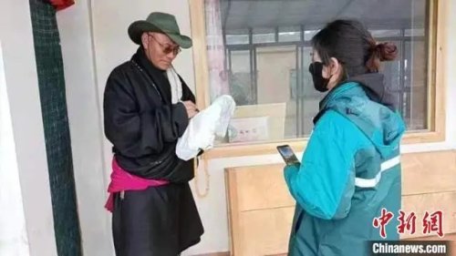圖為麥桃吉將快遞送到民眾手中。(資料圖,中國(guó)郵政集團(tuán)有限公司甘肅省瑪曲縣分公司供圖)