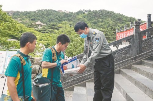 謝菲俊(右)給黃山風(fēng)景區(qū)玉屏環(huán)衛(wèi)所放繩工李培生送報(bào)刊信件。