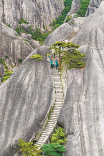 路,懸掛于陡崖峭壁,穿越流云瀉霧,蜿蜒至海拔1860米的黃山光明頂上——