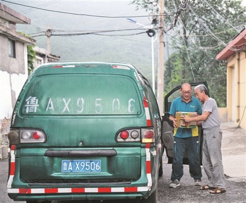 帶著這些郵件,許桂明駕駛郵車冒著大雨在蜿蜒的山路上行進。“上午還是烈日當頭,汗流浹背,下午就是瓢潑大雨,全身淋透,這在山區(qū)很正常。”許桂明說。停好車,撐起傘,許桂明把郵件緊緊抱在懷里,沿著小路跑進村里。10年來,他始終牢記“人民郵政為人民”的服務(wù)宗旨,走遍了這15個行政村的家家戶戶,與村民們相熟相知,遇到不方便外出購物的老人以及需要幫助的村民,他都主動幫助捎送生活物資。