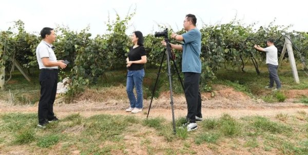 采訪組在農(nóng)戶幫助下體驗采摘獼猴桃