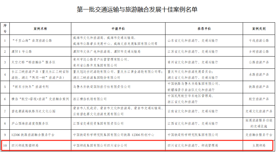 近日,文化和旅游部、交通運(yùn)輸部、國家鐵路局、中國民航局、國家郵政局、國鐵集團(tuán)共同遴選出第一批交通運(yùn)輸與旅游融合發(fā)展十佳案例10個(gè)和典型案例36個(gè)。由四川省文化和旅游廳、四川省郵政管理局推薦申報(bào)的“四川郵政熊貓郵局”(以下簡稱為“熊貓郵局”)獲評十佳案例,成為全國郵政管理系統(tǒng)參選案例中唯一獲此殊榮的案例。