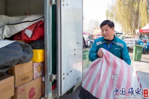 郭海玉正在將包裹搬上郵政車。中國雄安官網(wǎng)高盟 攝
