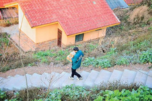 郵政小哥穿梭在蜿蜒的聯戶路上投遞包裹。 □吳敏 攝
