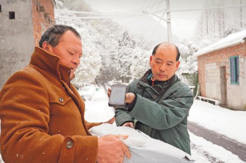 “哇,好大的雪呀!”1月22日晨,浙江省金華市的百姓為眼前的雪白一片所震驚,“十多年了,都沒見到過這么大的雪了!”整個金華市城鄉都蓋上一件厚厚的“雪衣”。通往婺城區安地鎮山村的公路已經被交警攔住,普通車輛禁止上山。此時,只有一抹“綠色”在一步一步走進山村。這是金華市郵政分公司安地投遞班的郵遞員在給村民送去郵件。