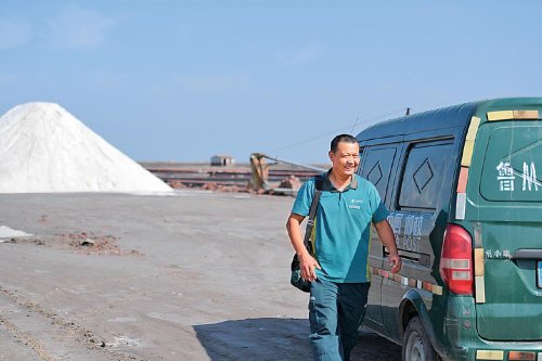 王海進(jìn)在鹽場(chǎng)工地投遞郵件。