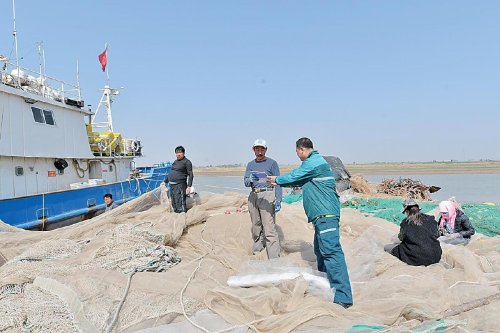 無棣埕口郵政支局投遞員王海進(jìn)在投遞途中幫客戶倒網(wǎng)收蝦。
