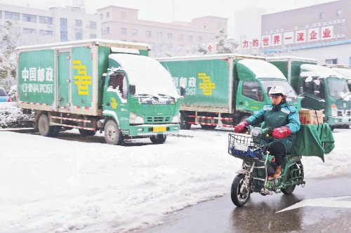 湖北省武漢市郵政分公司在做好人員、車輛安全防范的情況下,攬投部全部正常對外服務;投遞員迎雪而上,提前到崗,做好車輛檢查、郵件分揀等班前準備工作。同時,合理規劃投遞路線,抓緊時間出班,及時將郵件安全、高效送到市民手中。