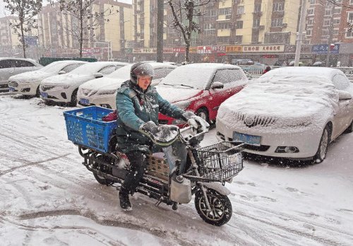2月4日,江蘇省淮安市迎來強降雪。淮安郵政分公司投遞人員堅守崗位,在大雪中小心騎行,將一份份報紙、一件件包裹準時送到客戶手中。 □陳浩 攝影報道