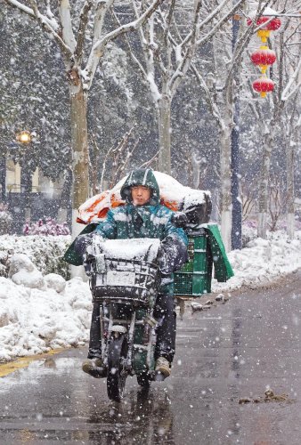 2月4日,湖北省武漢市氣象臺發布道路結冰橙色預警,全城一片銀裝素裹。全市159個投遞點(含郵政支局)全部正常對外服務,郵政快遞小哥頂風冒雪堅持投遞,成為了冬日里一道別樣的風景。□肖芳 潘芬 張斌 攝影報道